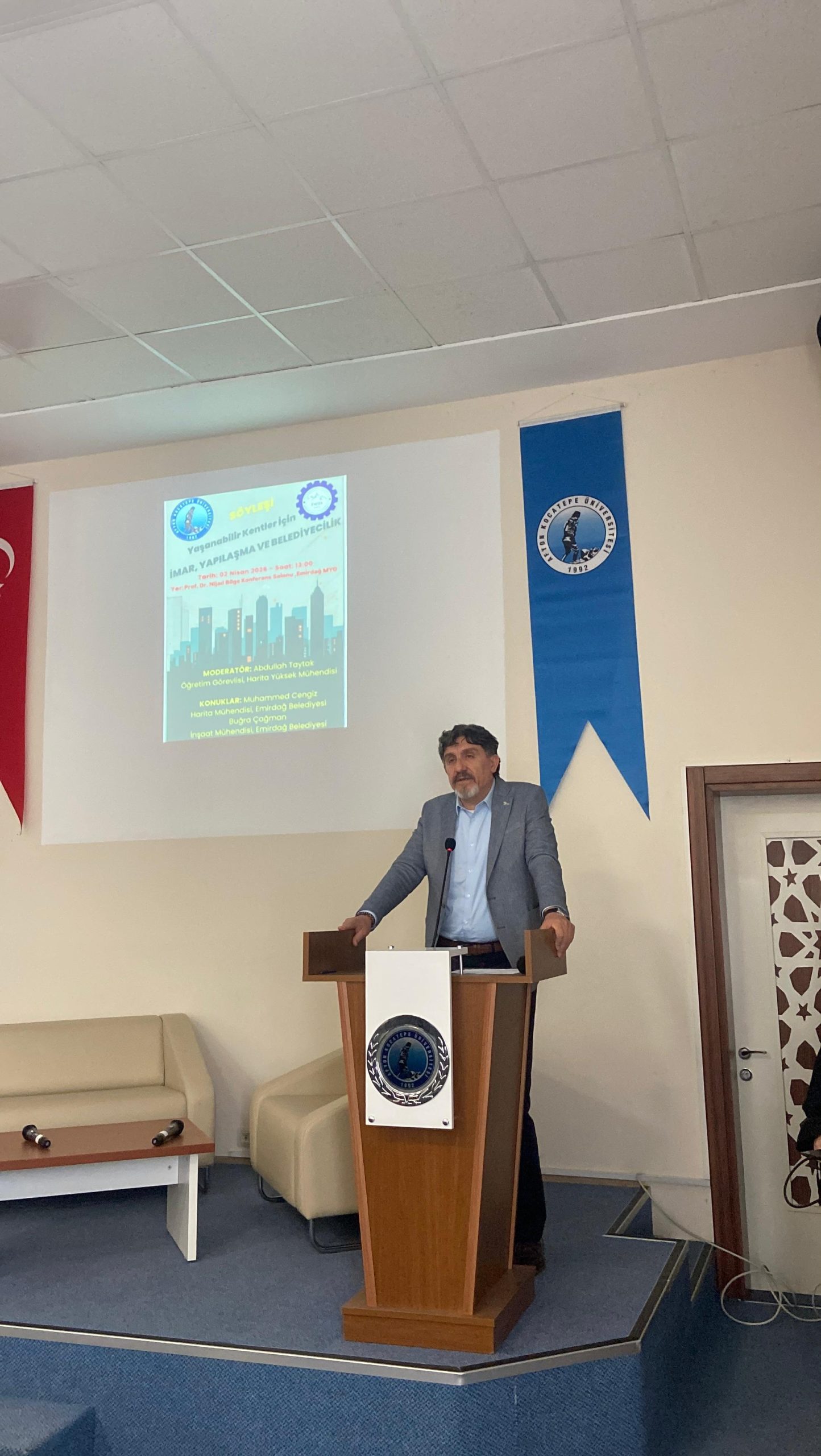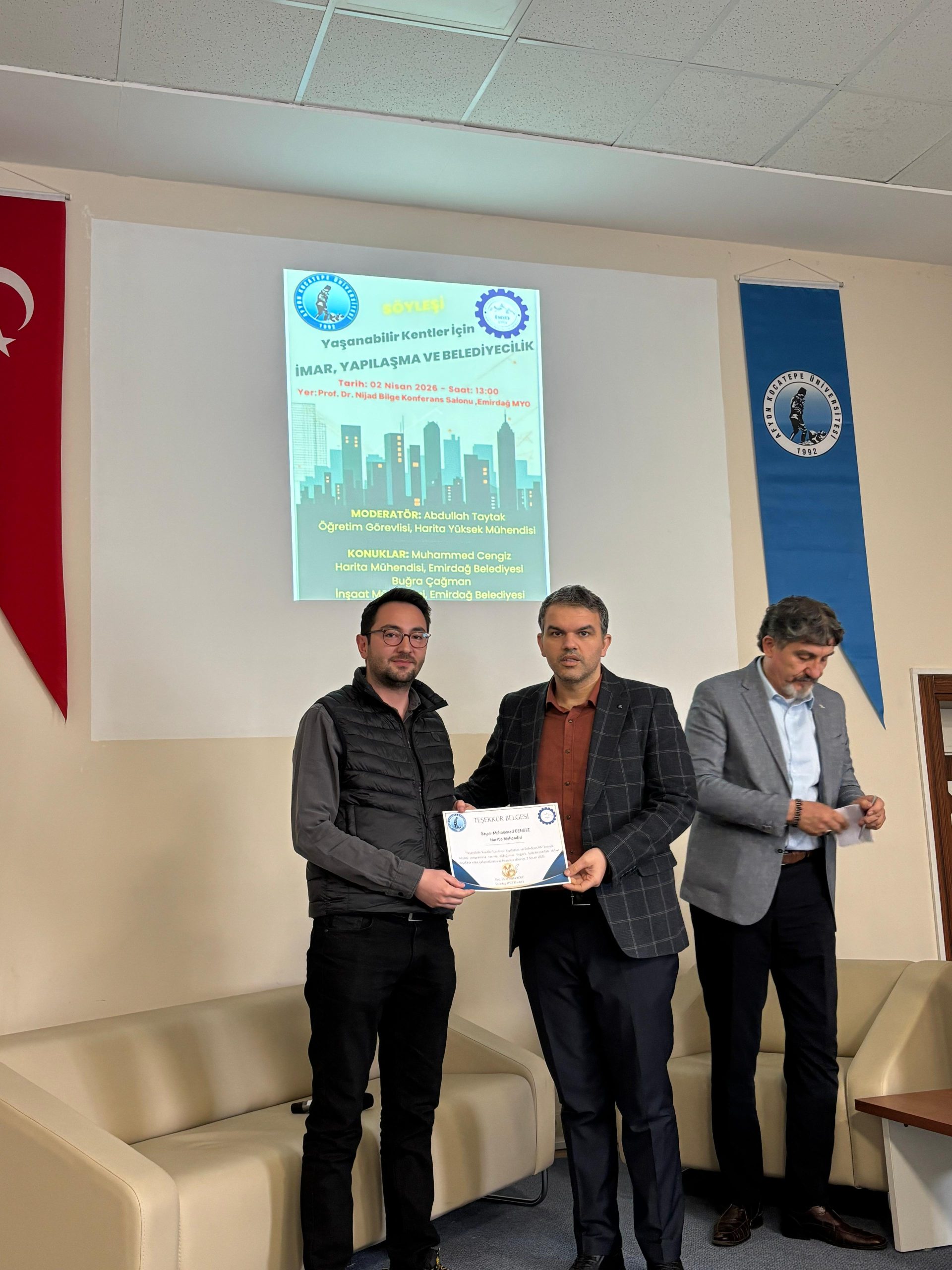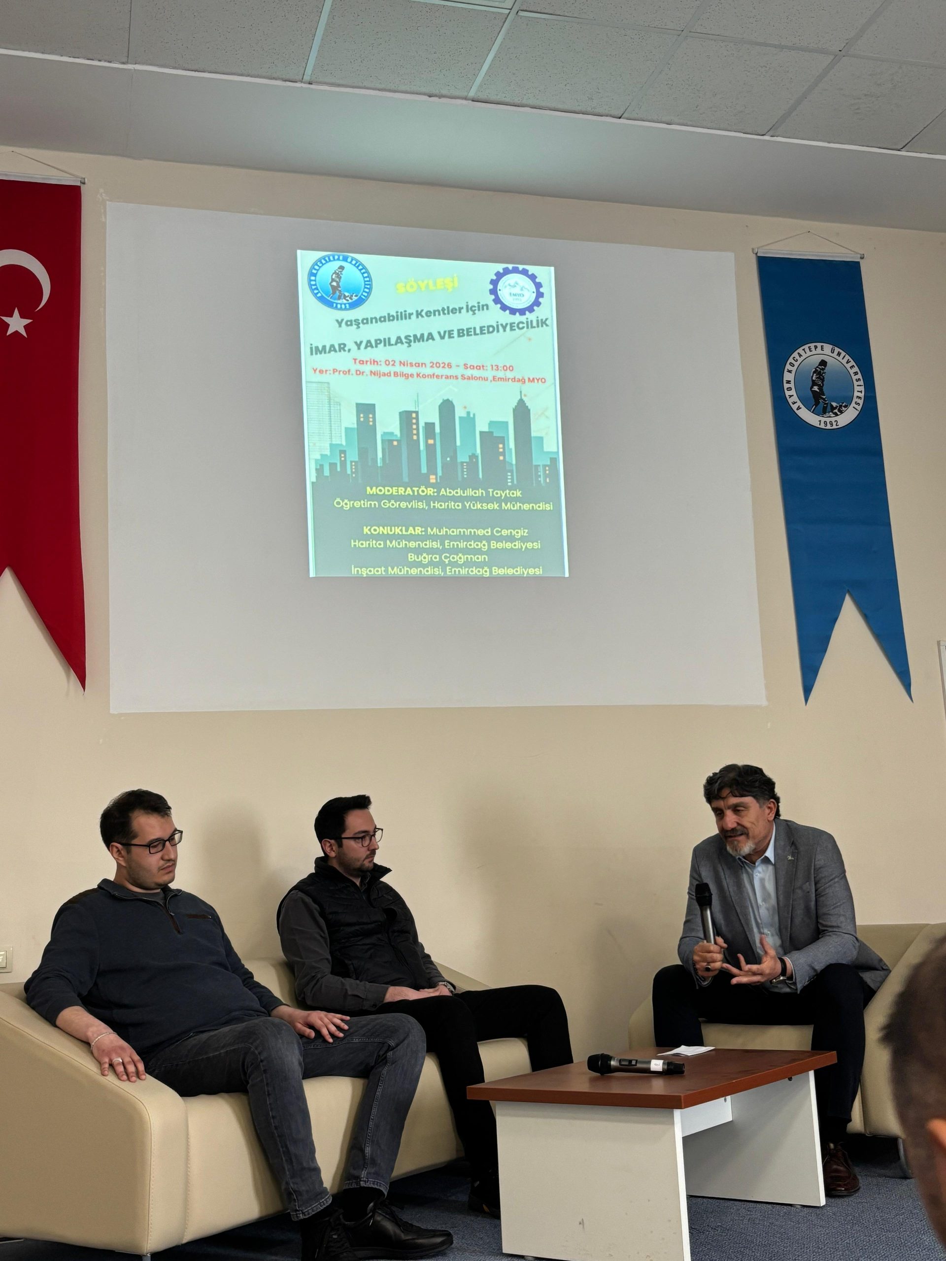 Programa, Emirdağ Belediyesinden harita mühendisi Muhammed Cengiz ve inşaat mühendisi Buğra Çağman konuk olarak katılmıştır. Program, okul müdürü Doç. Dr. Sayın Mustafa Köse’nin açış konuşması ile başlamış, Öğr. Gör. Abdullah Taytak’ın sunuşu ardından söyleşi ile devam etmiştir. Söyleşide Yaşanabilir kentleri oluşturmak, mücavir alan kavramı, imar planları oluşumu-tadilatı, ülkemizin bir gerçeği olan depremlerde şehrin imar durumunun etkileri, yapılaşma biçimleri nasıl-neden-sonuç ilişkileri, yapıların inşaat ruhsatı süreci, belediyelerimizin durumları konularında ki vizyonel bir bakış gerçekleştirilen program da haritacılık ve inşaat mesleki disiplinleri şehirlerin planlı ve adil gelişiminden afet risklerinin yönetilmesine, mülkiyet güvenliğinden altyapı, enerji ve ulaşım projelerine kadar oldukça geniş bir etki ve yetki alanına sahip temel, teknik iki mesleki disiplin olduğu vurgulanmış olup, imar ve inşaat ile ilgili mevzuat hükümlerinin önemi ve uyulması ile saha da karşılaşılan bir çok sorunun ortadan kalkacağı ifade edilmiştir. Programın sonunda, soru cevap kısmında konuklar öğrencilerimizden gelen soruları cevaplamıştır.