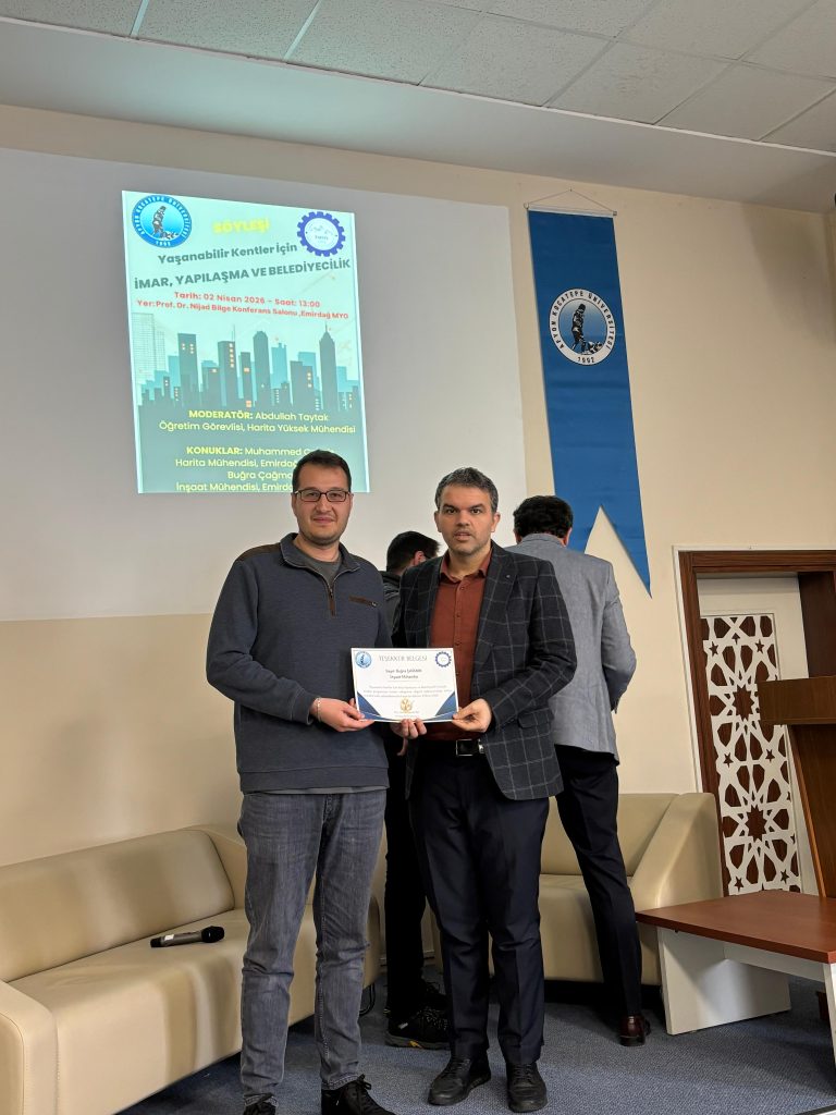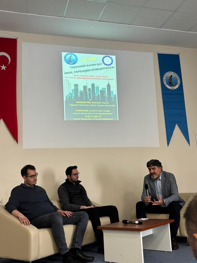 Okulumuz 2026 yılı sosyal- kültürel faaliyetleri kapsamında, harita kadastro programı, yapı denetimi programı öğrencileri ve ilgi gösteren diğer öğrencilerimize yönelik okulumuz öğretim görevlisi Abdullah Taytak’ın hazırlayıp, yönettiği “Yaşanabilir Kentler İçin İmar-Yapılaşma ve Belediyecilik” konulu söyleşi programı gerçekleştirilmiştir.